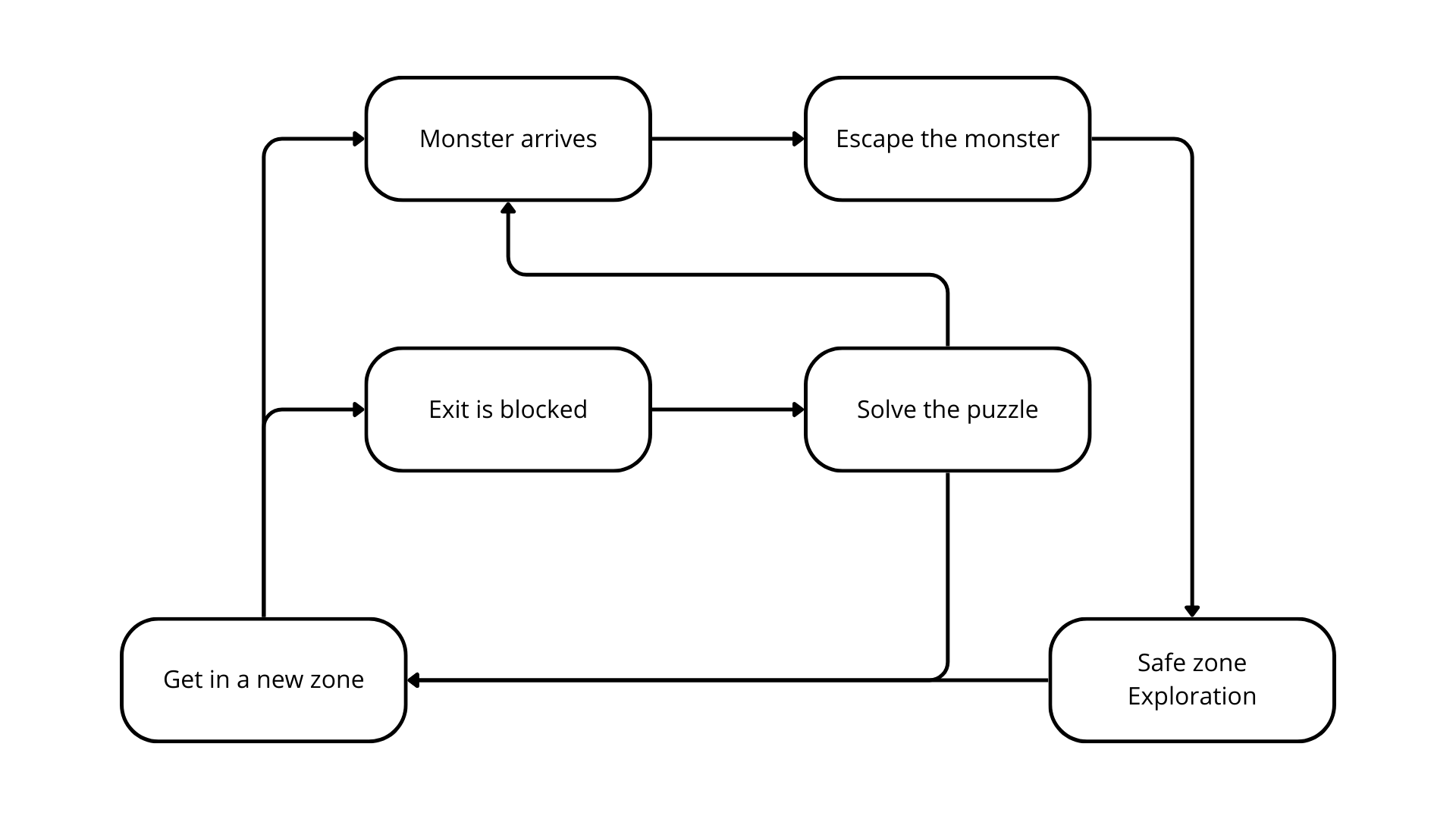 Inspired by games such as Little Nightmares, we opted for a mostly side-scrolling game with puzzles and monsters.Originally, the player was supposed to enter a room and, depending of its type, flee the monster or solve the puzzle. Then he would be awarded with exploration to learn more about the world before going into the next zone. However, by reducing our scope, we had to simplify the loop. So we merged the two types of rooms into one. A maze with a puzzle to solve while we are hunted by the creature.